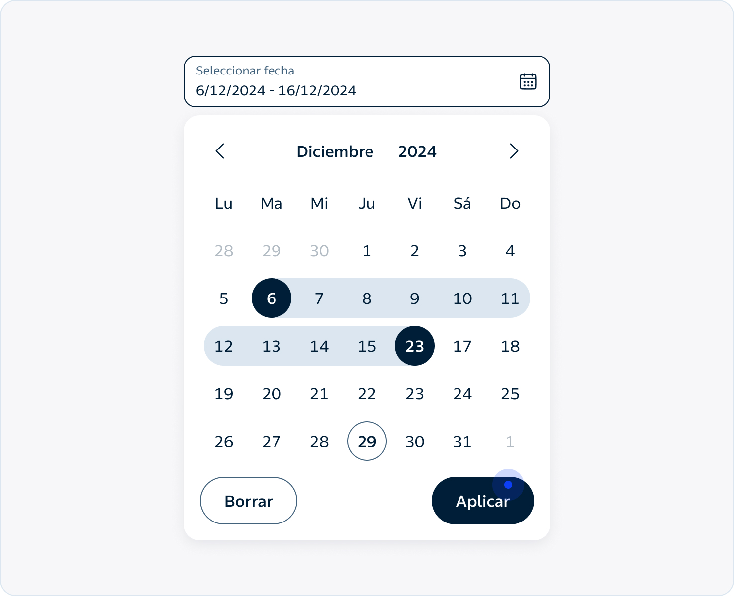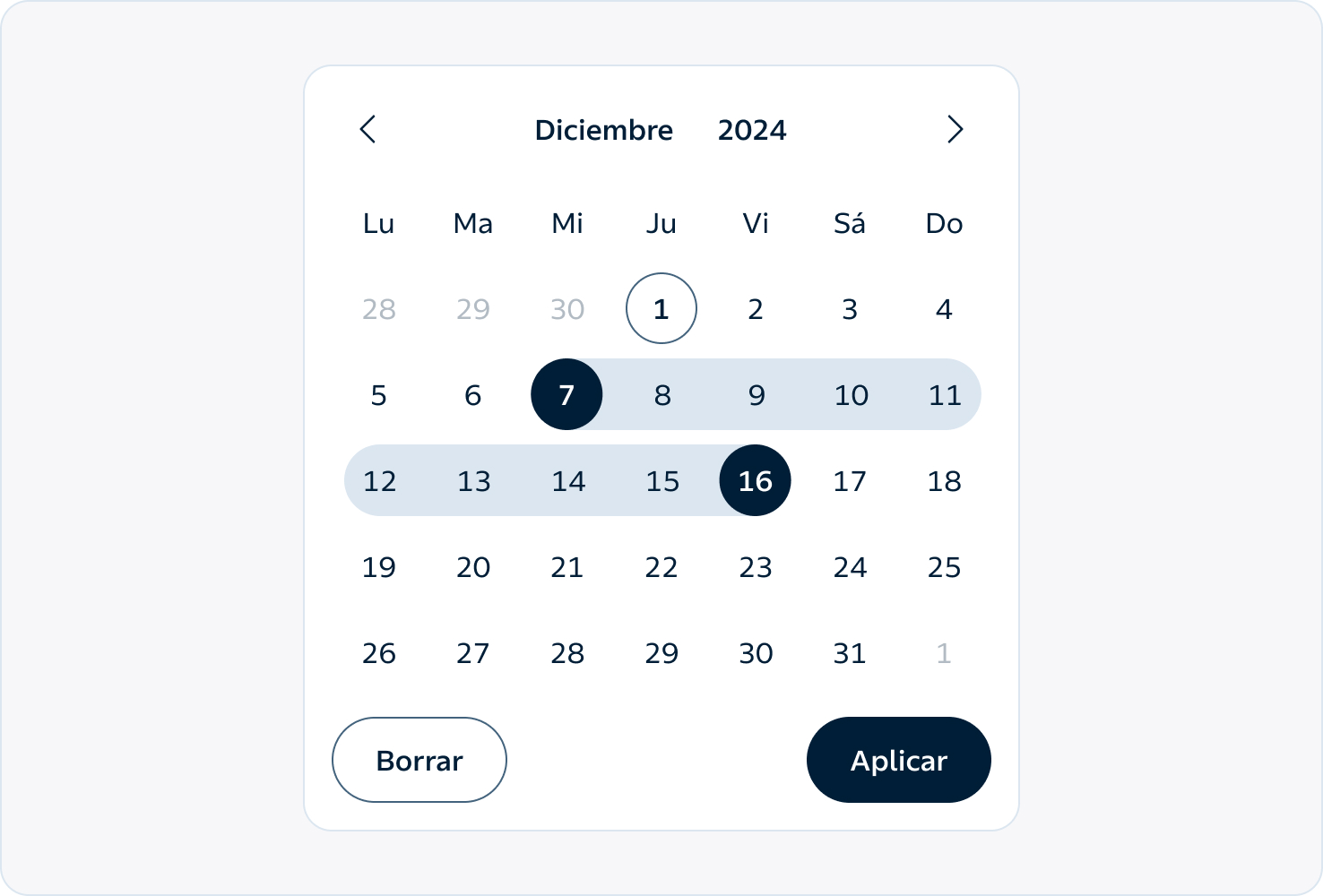 El componente Calendar permite a las personas seleccionar una fecha o un rango de fechas de manera rápida y visual. En Energy lo diseñamos para ser claro, accesible y coherente con el resto de la interfaz, ayudando a que la experiencia sea fluida y sin fricciones. Su objetivo es facilitar la interacción, evitando que el usuario tenga que escribir manualmente una fecha y reduciendo errores.