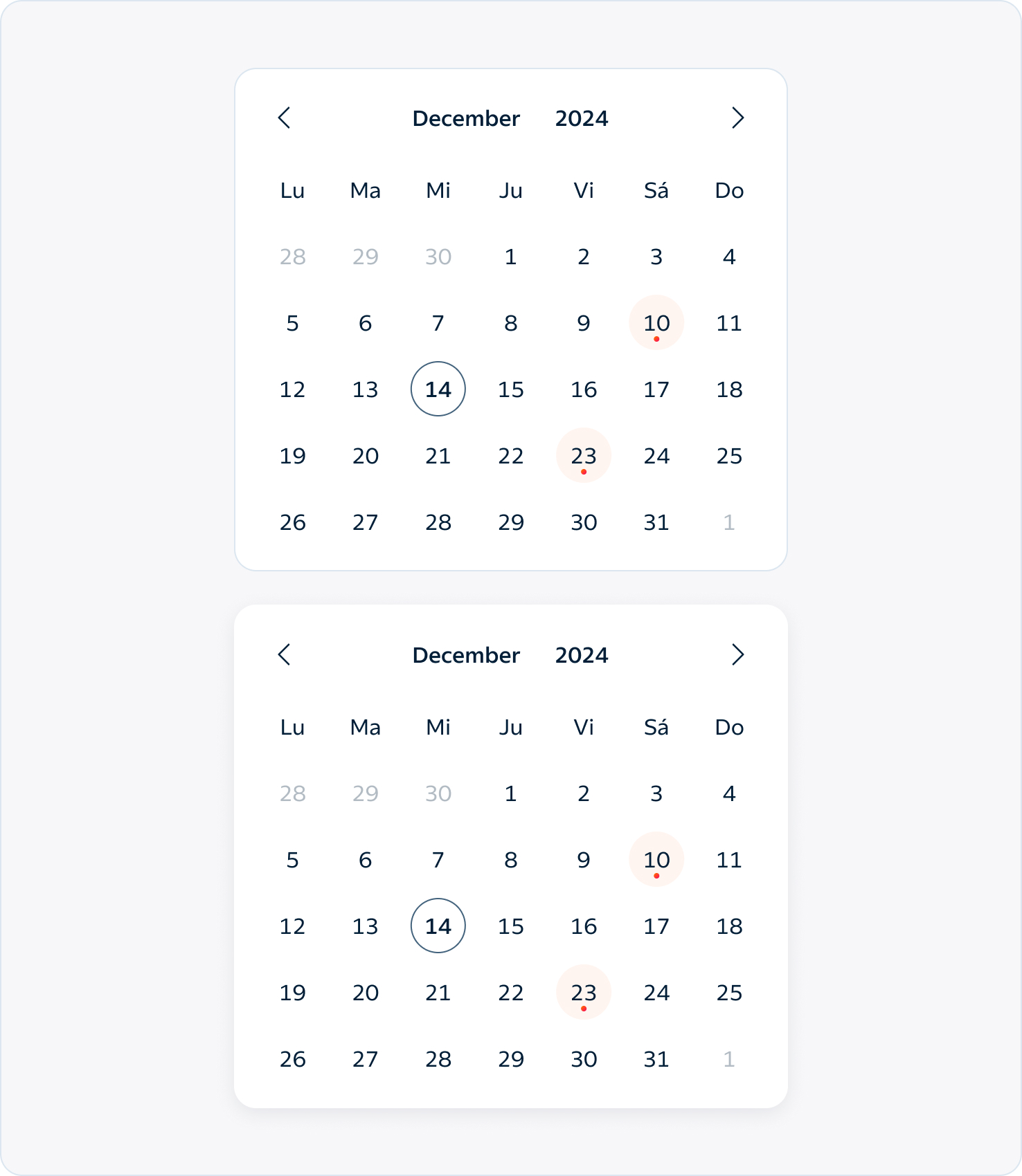 El calendario default se utiliza principalmente para visualizar fechas con eventos asociados, sin marcar rangis de fecha. Esta variante puede tener dos configuraciones: