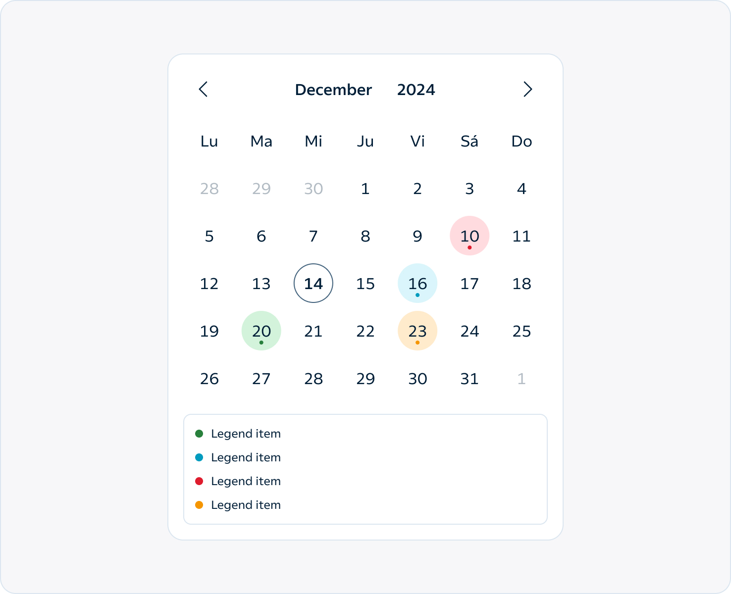 La leyenda funciona como una pequeña guía visual que explica qué significa cada color dentro del calendario. Así, cada color se asocia a un estado o categoría de día, como por ejemplo disponible, reservado o con evento.
