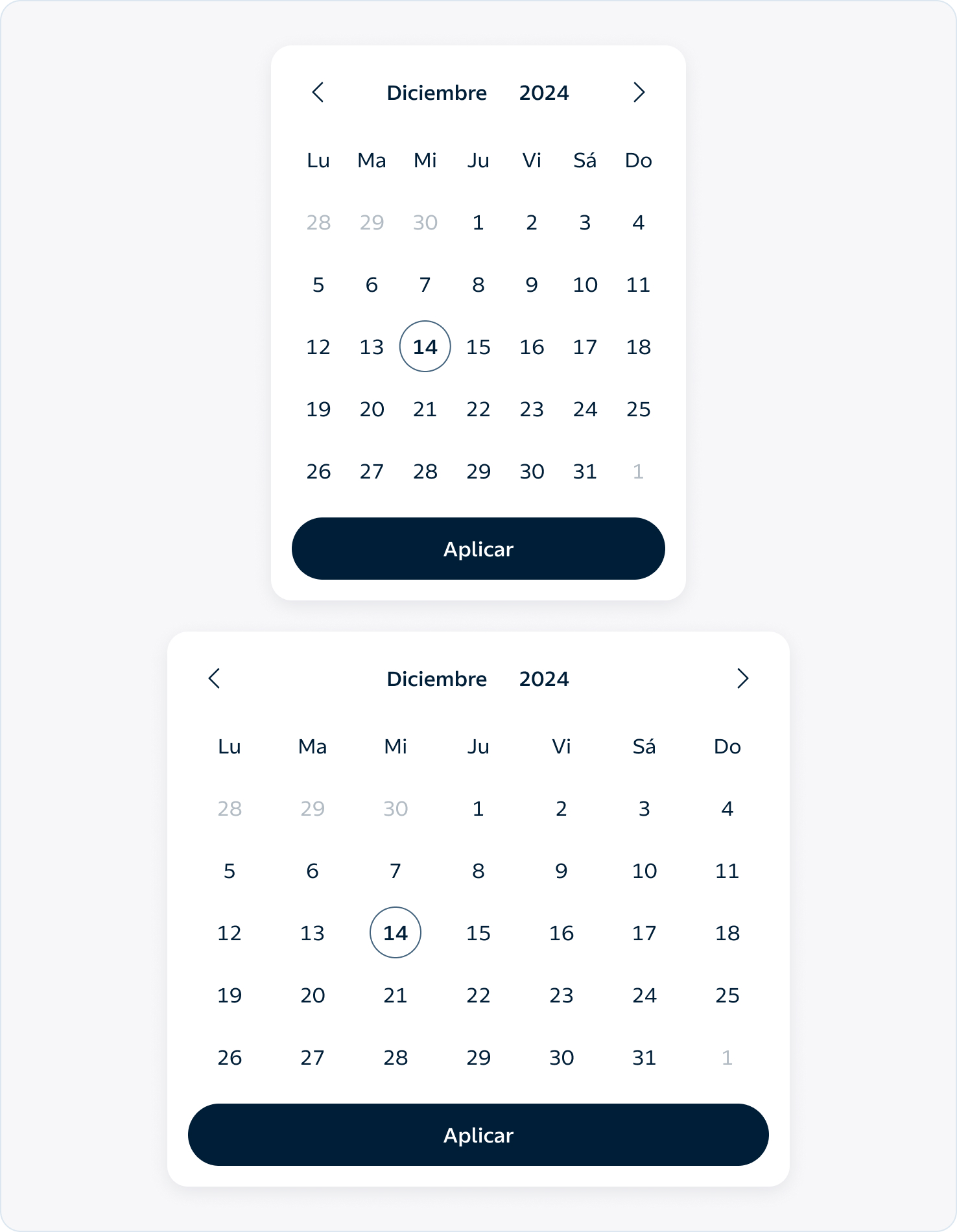 También abarca la manera en la que la persona usuaria puede navegar y seleccionar años, meses o días, asegurando una interacción fluida y accesible. Estos comportamientos están diseñados para que el calendario se perciba claro, flexible y fácil de usar, tanto en pantallas pequeñas como en entornos más amplios.