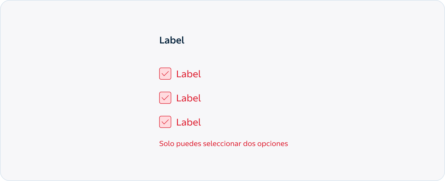 Errores en grouping: Cuando ocurre un error en elementos relacionados entre sí, se recomienda marcar en estado de error todas las opciones bloqueantes. En caso de necesitar mostrar un mensaje de ayuda, se hará al final de la agrupación, utilizando estilo caption 2.