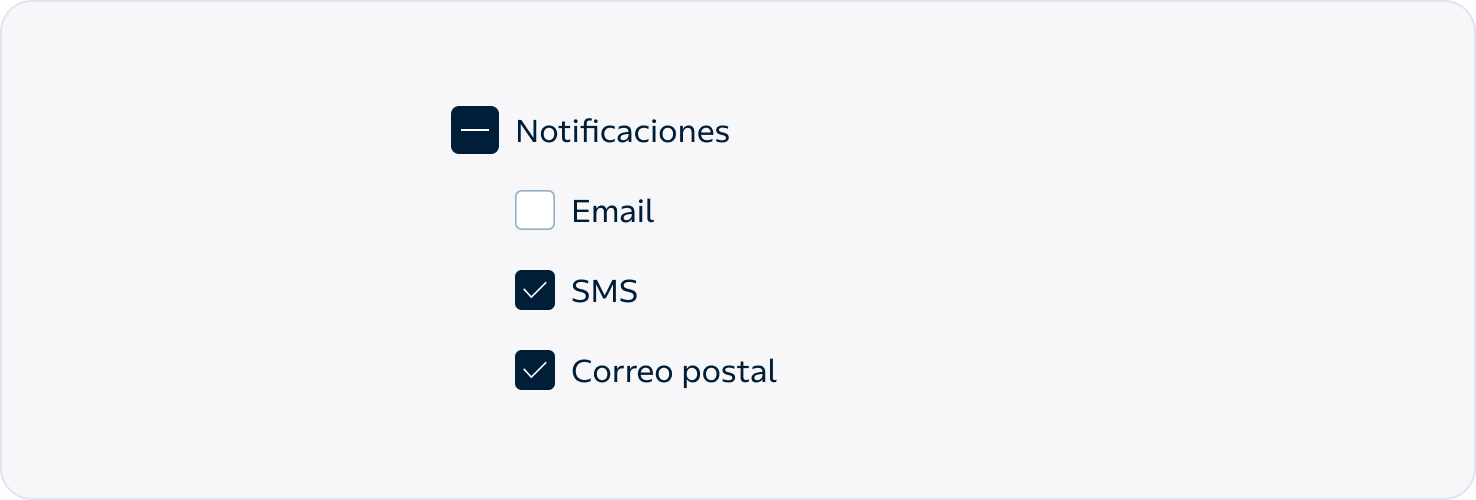 Cuando se agrupan varios checkbox dentro de otro, puede pasar que no todos estén marcados o desmarcados. En ese caso, se muestra un estado intermedio para indicar que la selección está a medias.