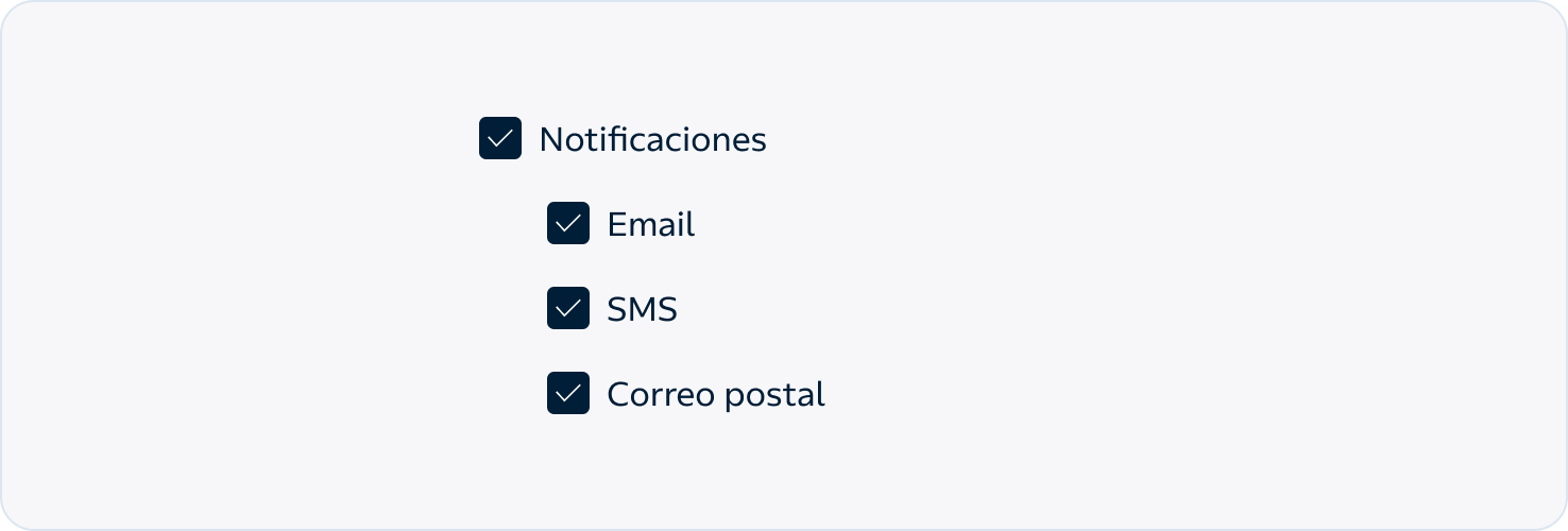 Checked: Estado en el que todas las opciones están seleccionadas. Si desmarcas la checkbox principal, se desactivarán automáticamente todas las interiores. Si desmarcas solo alguna interior, la principal pasará a un estado intermedio para reflejar que la selección ya no es completa.