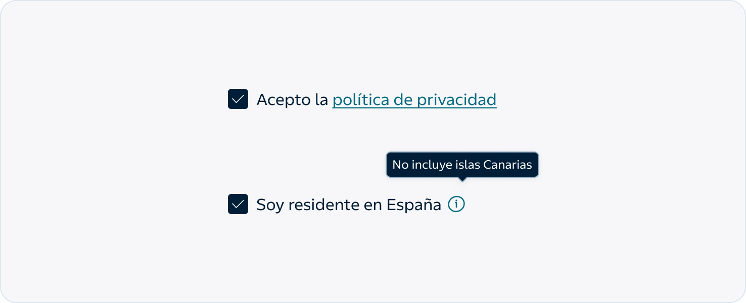 - Si se trata de dar feedback sobre el estado de un proceso o formulario relacionado con el checkbox (por ejemplo, mensajes como “Pendiente de validar” o “Válido hasta tal fecha”), es mejor usar un tooltip para que el mensaje aparezca justo al lado del checkbox.